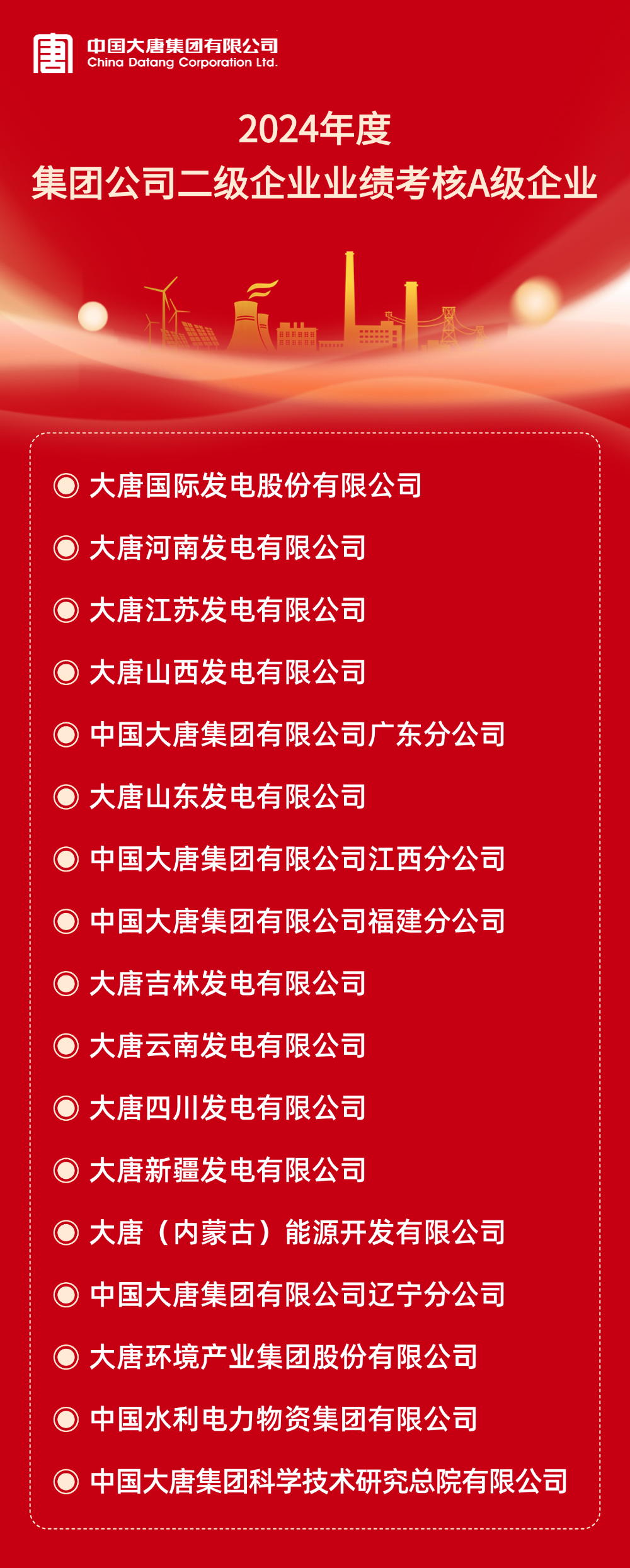 本網訊 根據《中國大唐集團有限公司所屬企業年度業績考核辦法》和《中國大唐集團有限公司所屬企業任期業績考核管理辦法(試行)》及有關規定,2024年度及2022-2024年任期二級企業業績考核結果已經集團公司董事長專題會審議通過。A級企業名單如下: