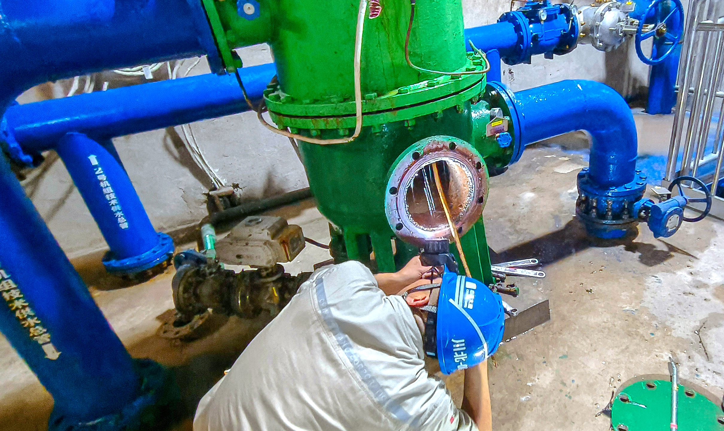 “開干!”王坤松低吼一聲,拿起清理鉤率先探身進去,奮力拉扯堵塞物;李沛德緊隨其后,用硬毛刷對著濾網拼命刷洗。泥漿四濺,片刻間,兩人成了徹頭徹尾的“泥人”。