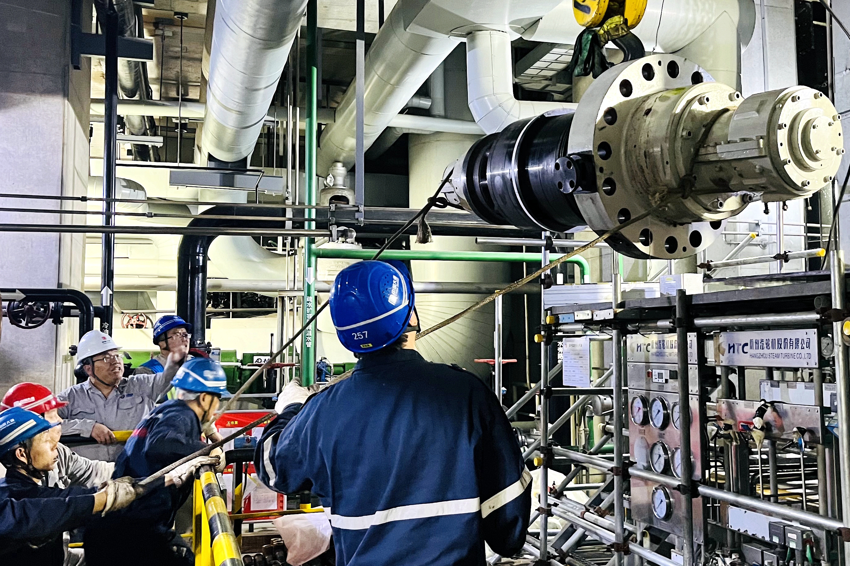 下午3點(diǎn),2號(hào)機(jī)零米給水泵處,日光順著層間通道的高窗斜切進(jìn)來(lái)。“起鉤——慢著,左擺半寸!”秦嶺發(fā)電公司承攬富平熱電維檢工作的項(xiàng)目部汽機(jī)專工李強(qiáng)攥著對(duì)講機(jī)的指節(jié)泛白,安全帽檐下的眼睛緊盯著半懸的給水泵芯包。起重工武強(qiáng)握著吊機(jī)操作桿,指腹貼在按鈕上緩著勁:“收到,擺幅控制住了。”這龐然大物裹著剛檢修完的金屬冷光,已吊至泵體上方,正等著“登堂入室”嚴(yán)絲無(wú)縫嵌進(jìn)泵體里。