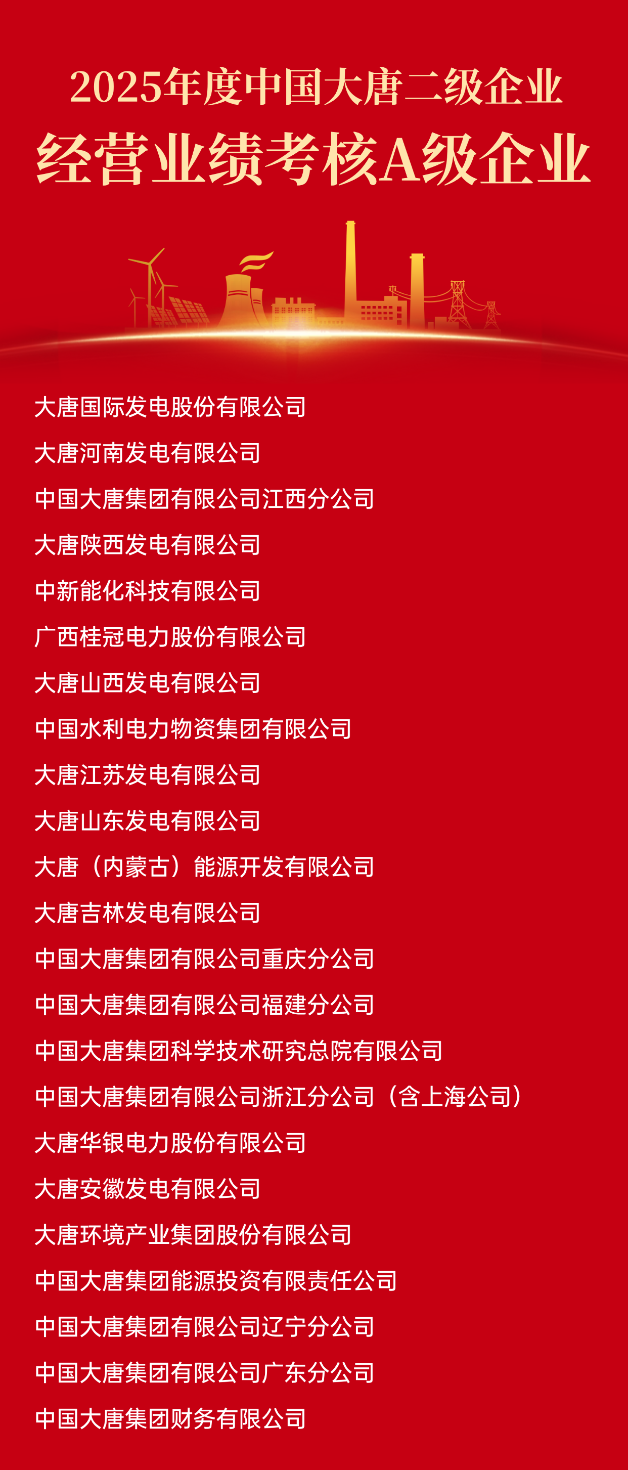 根據《中國大唐集團二級企業及負責人經營業績考核辦法》及有關規定,2025年度二級企業經營業績考核結果已經中國大唐2026年第1次董事長專題會審議通過。A級企業名單如下: